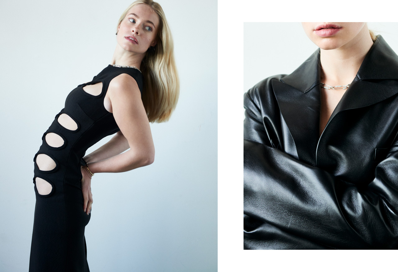 Look for a cut out dress that still leaves something to the imagination, like this strategically placed cut out black dress from Christopher Esber. Toughen it up with a leather or faux leather blazer, or a cropped wrap-around jacket circa 90s Basic Instinct era.