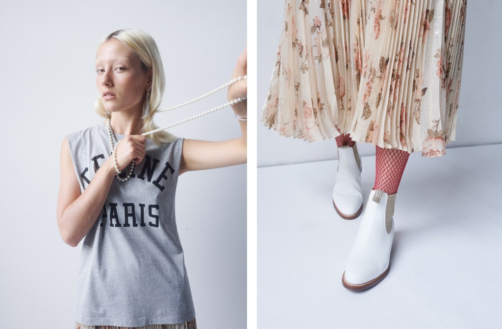LEFT: TOP, SHOP SIMILAR, SKIRT, SHOP SIMILAR, CELINE. 18K WHITE GOLD DIAMOND SIGOURNEY STUD EARRINGS, JAN LOGAN, SHOP NOW. TWO TONE COLE NECKLACE, ARMS OF EVE, SHOP NOW. TIFFANY T T1 NARROW DIAMOND HINGED 18K WHITE GOLD MEDIUM BANGLE, TIFFANY & CO, SHOP NOW. TWO POINT TUBE SILVER BANGLE, SENER BESIM, SHOP SIMILAR. RIGHT: SKIRT, CELINE, SHOP SIMILAR. LADY YEARLING RUBBER SOLE BOOTS, R.M WILLIAMS, SHOP NOW