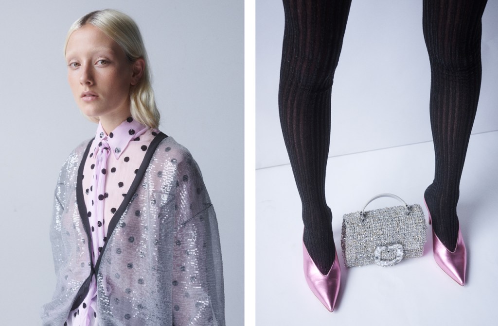 LEFT: SILVER SEQUIN EMBROIDERED TULLE CARDIGAN, SHOP NOW, CYCLAMEN EMBROIDERED CHIFFON SHIRT, SHOP NOW, PRADA. RIGHT: VERYVEE HEELS, CHRISTIAN LOUBOUTIN, SHOP SIMILAR. LUREX SOCKS, PRADA, SHOP SIMILAR. LOVITT BUCKLE BAG, KATE SPADE, SHOP SIMILAR