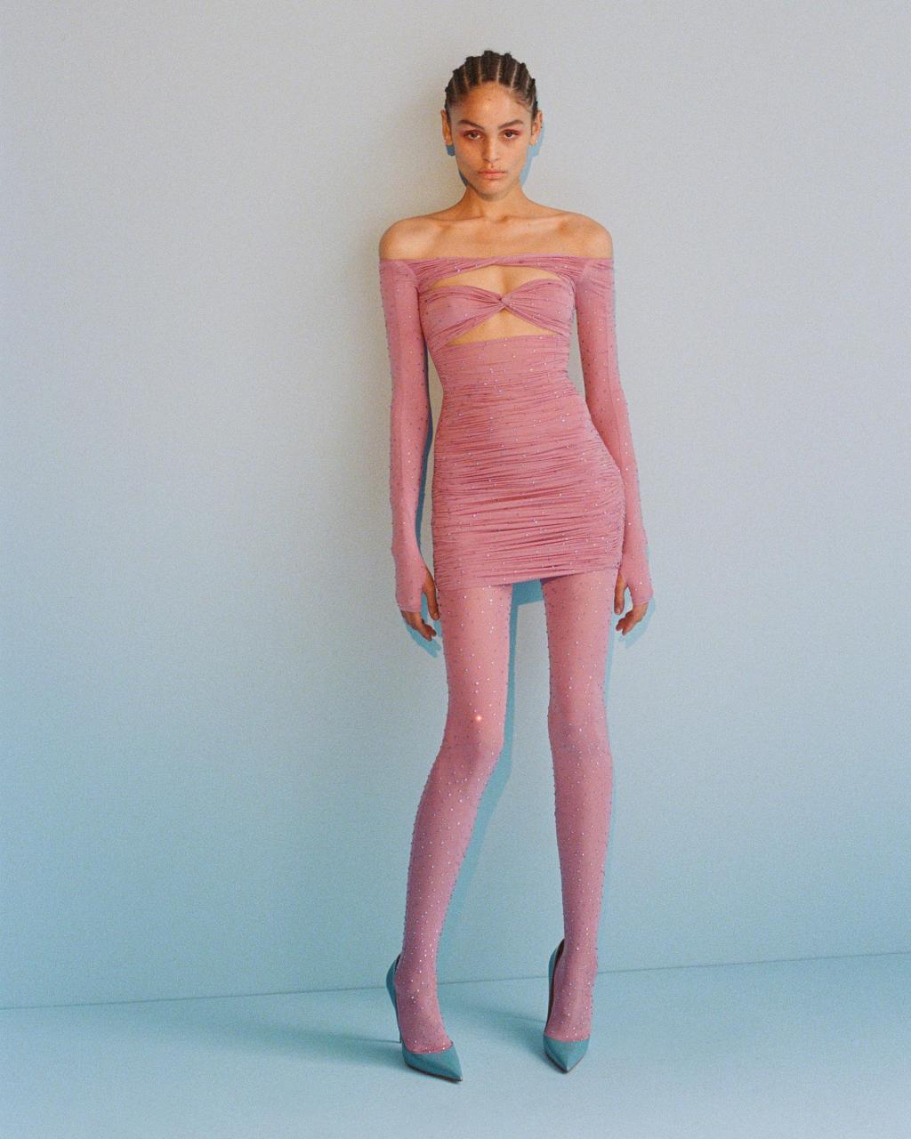 Pulled from the forthcoming fall/winter 2022 collection, Bieber wore an off-the-shoulder cutout mini dress in a sweet baby pink hue. While on the runway the dress was styled with matching glittering stockings, the model chose to keep her legs bare and paired a leather jacket over the top. The look was finished with Tiffany & Co. Tiffany HardWear Link earrings, styled by Karla Welch and Grace Wrightsell.